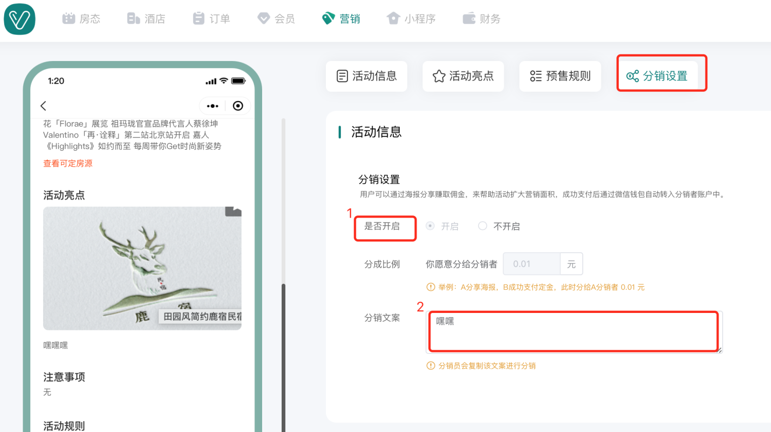 - 分销功能开启按钮:当我们创建活动时【开启】分销活动,则后期可以更改为【不开启】